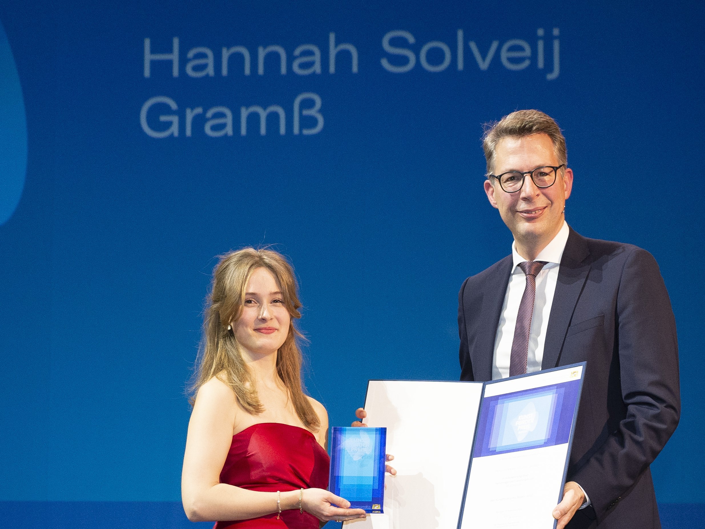 On 27 November, the prestigious Bavarian Art Promotion Awards were once again presented at the Gärtnerplatztheater in Munich. Two alumnae of the HfM Würzburg were among this year's prize winners: Hannah Solveij Gramß (Bachelor Violin) and Jonas Sorgenfrei (Bachelor Jazz Drums with a teaching certificate in Jazz Singing). Both were honoured by Minister of State Markus Blume for their outstanding musical achievements.
