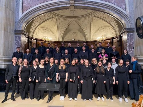 In mid-October, the University of Music's chamber choir gathered before the start of term to set off on an excursion to Berlin. In a week of intensive rehearsals, the young singers prepared a concert programme that included Distler's "Totentanz" and excerpts from Rheinberger's "Cantus Missae".