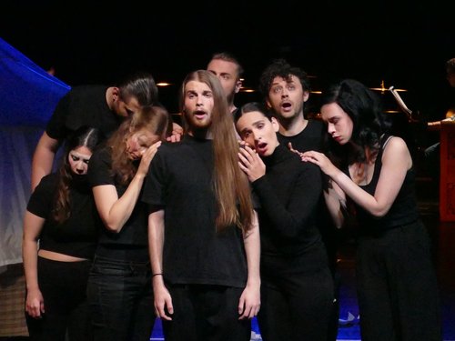 Unter dem Titel GLAUBE, LIEBE – HOFFNUNG? lotet die Opernschule Konflikte aus, die zwischen Liebenden entstehen können, insbesondere dann, wenn starke religiöse Gefühle der Liebe entgegenwirken. Wir leben in einem Jahrhundert, in dem Kriege allgegenwärtig sind, aus unterschiedlichsten Motivationen – aber eben auch wegen religiöser Differenzen. Religiöser Radikalismus ist (wie jede Form von Extremismus) zu keiner Zeit Teil der Lösung gewesen, sondern immer Teil des Problems. Umso erstaunlicher ist es, dass in vermeintlich aufgeklärten, säkularen Gesellschaften plötzlich wieder Gesinnungskriege geführt werden, dass Freiheiten, die man längst als selbstverständlich ansah, wieder in Frage gestellt werden, und dass Menschen wegen ihres Glaubens diskriminiert werden. Es zeigt uns, dass der Glaube zu allen Zeiten und auch heute eine ähnlich heftige Antriebskraft sein kann wie die Liebe. Und dass er die Menschen zu ähnlich irrationalen, zerstörerischen Handlungen anstacheln kann. Diese Geschehnisse finden wir in Musik(theater)stücken, die 400 Jahre alt sind, ebenso wie in neuesten Werken – das allein beweist die Zeitlosigkeit dieser Problematik. Mit elementaren Mitteln setzt die Bühne Zeichen aus Licht und Dunst, Papier und Stoff. Die Kostüme tragen biographische Merkmale der einzelnen Charaktere und weisen Spuren von Durchbrochenheit und Zerstörung auf. Die Inszenierung vertraut ganz auf die Spannung zwischen den einzelnen Darstellern, auf Gruppendynamik und die Kraft der Person im Raum. So erschließen wir uns die Gefühle und Konflikte der Figuren, ihren Glauben und ihre Liebe – ob es für sie wohl auch Hoffnung gibt?