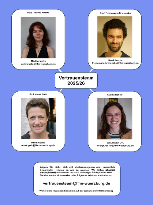 Zögern Sie nicht, sich mit studienbezogenen oder persönlich belastenden Themen an uns zu wenden. Dabei kann jederzeit auch eine zweite Person zum Gespräch mitgebracht werden. Sie können das ganze Team unter vertrauensteam@hfm-wuerzburg.de kontaktieren oder einzelne Mitglieder direkt anschreiben.